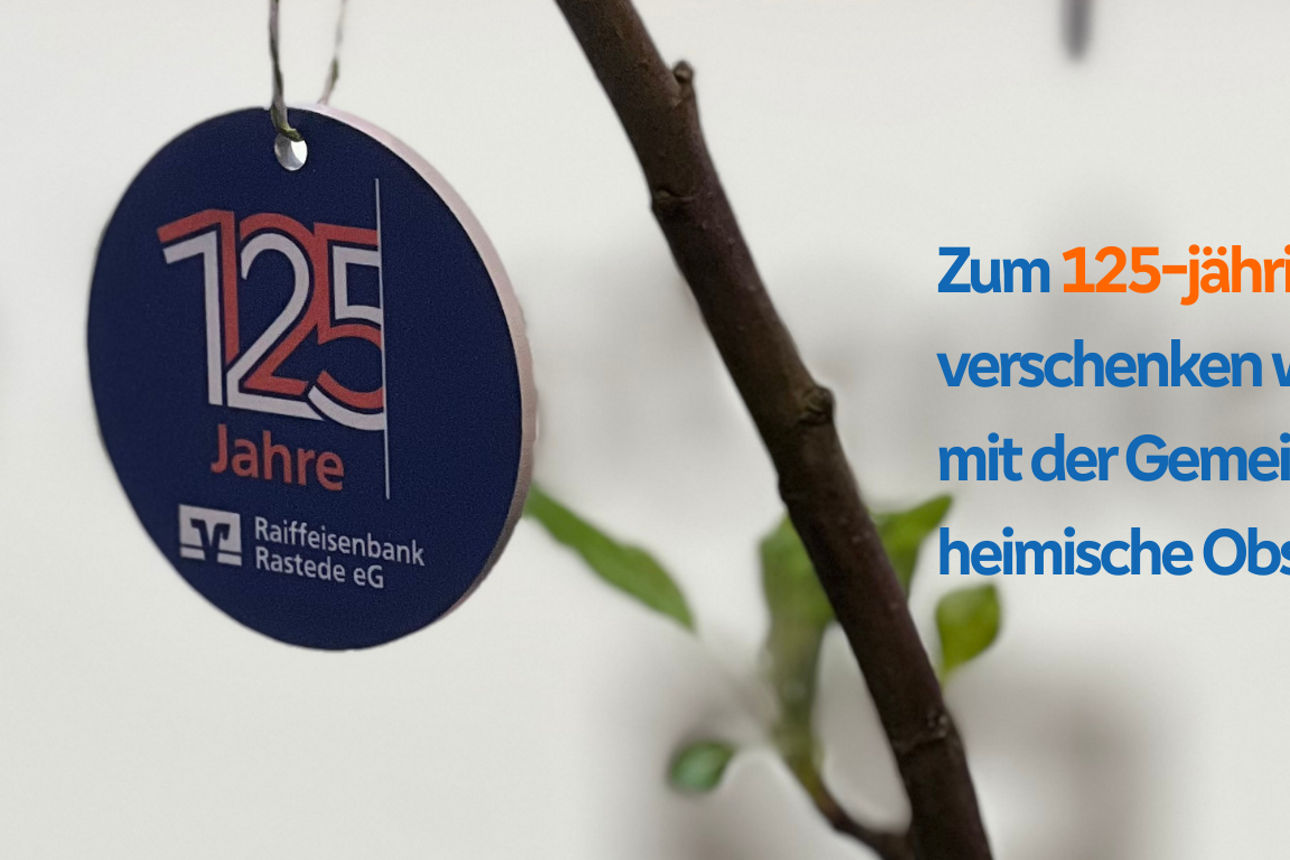 Im Rahmen unseres 125-jährigen Jubiläums freuen wir uns, in Kooperation mit der Gemeinde Rastede eine ganz besondere Aktion anzubieten: In diesem Frühjahr werden heimische Obstbäume an interessierte Bürgerinnen und Bürger verschenkt. Die Initiative steht im Zeichen unseres Engagements für Nachhaltigkeit und Gemeinschaftsgeist in der Region.
